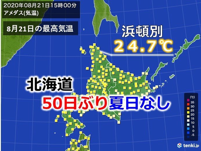 昨日(21日)の北海道は、最も気温の上がった宗谷地方の浜頓別でも24.7度にとどまり、7月2日以来、50日ぶりに1地点も夏日にすらなりませんでした。