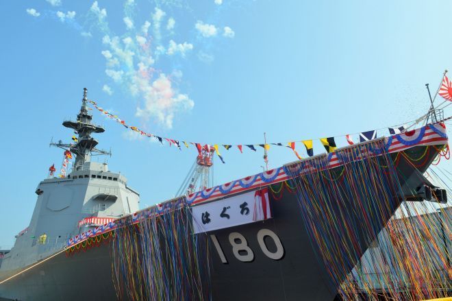 「はぐろ」の命名・進水式は7月17日、梅雨の晴れ間の昼下がり、横浜港に臨む造船会社ジャパン・マリンユナイテッドの磯子工場でありました。防衛相の命名書が読み上げられ、艦の側面にある掲示板にかかった紅白の幕がするすると開き、艦名が現れました。「はぐろ」は信仰の山・出羽三山のひとつ、羽黒山(山形県鶴岡市)からきています。