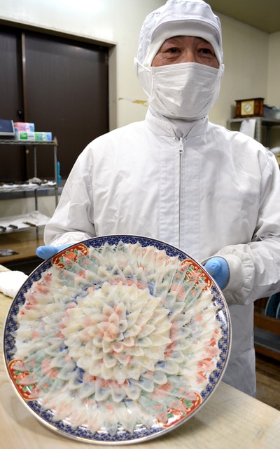 「海」としては、献上フグの調理は3回目だが、3代目の杉山匡秀社長(47)は社長就任後初めて。「緊張します。すごく光栄です」。調理を担当する木下秋人(あきと)さん(65)はフグを本格的にさばくようになって30年。献上フグを調理するのは2度目で、「特に力が入ります。味わって食べてもらいたい」と話した。(貞松慎二郎)