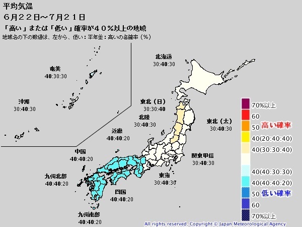 週ごとの予報によると、1週目(6/22~28)は前線が停滞しやすい沖縄・奄美で、平年に比べて曇りや雨の日が多い見込み。東・西日本は高気圧が北に偏って張り出す日が多く、日本海側は平年に比べて曇りや雨の日が少ない予想だが、湿った東よりの風の影響を受ける太平洋側は平年と同様に曇りや雨の日が多くなりそうだ。