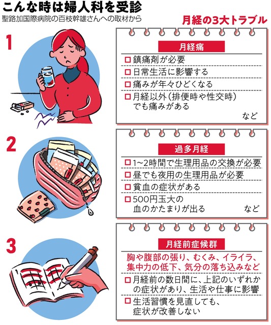 月経は、受精卵を迎え入れるために、毎月、クッションのように厚くなる子宮内膜が、妊娠に至らなかった場合、はがれ落ちて起こる。月経は病気ではないという考えから、不調を我慢する人は多い。しかし、聖路加国際病院女性総合診療部の百枝(ももえだ)幹雄部長(61)は「ひどい痛みや貧血になるほどの経血量は病気のサイン」と話す。