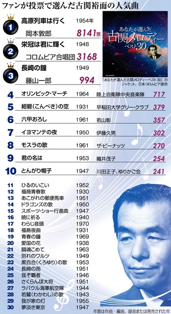 1位は、1954年発売の「高原列車は行く」。8千票超を集めて断トツの首位になった。福島県内を走っていた沼尻軽便鉄道の情景がモデルで、古関の軽快なメロディーに岡本敦郎(あつお)の伸びやかな歌声がはまり、爆発的ヒットを記録した。