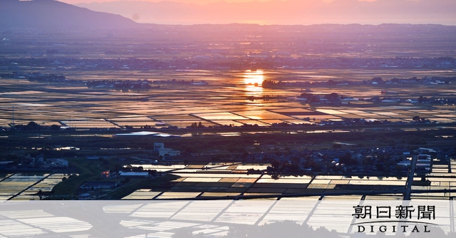 米どころ新潟の越後平野で、水をたたえた一面の田んぼが周囲の山々や空を映している。田植えが行われているこの時期限りの光景で、平野を一望できる田上町の護摩堂山では、水面をキラキラ輝かせながら佐渡島の向こうへ沈んでいく夕日に歓声が上がった。