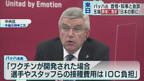 IOC(国際オリンピック委員会)のバッハ会長は菅総理や小池都知事らと相次いで会談し、開催に向けて連携を深めることで一致しました。 東京オリンピックの延期決定後、初めて来日したバッハ会長。菅総理は観客の参加を想定した開催方法の検討を進めていることを伝え、バッハ会長は選手や関係者へのワクチン確保に力を入れる意向を示しました。 グータッチで会談がスタートした小池知事からも開催に向けた強い意欲が示されました。ことし3月に新型コロナの感染拡大を受けて延期が決まり、開催まで残り9カ月となる中、バッハ会長は記者会見でワクチンが開発された場合、選手たちへの接種の費用はIOCが負担すると明言しました。一方、観客数についてやコロナ対策以外の大きな課題となっている、3千億円とも言われる延期による追加費用の負担については、「時期尚早だ」とし、明らかにしませんでした。