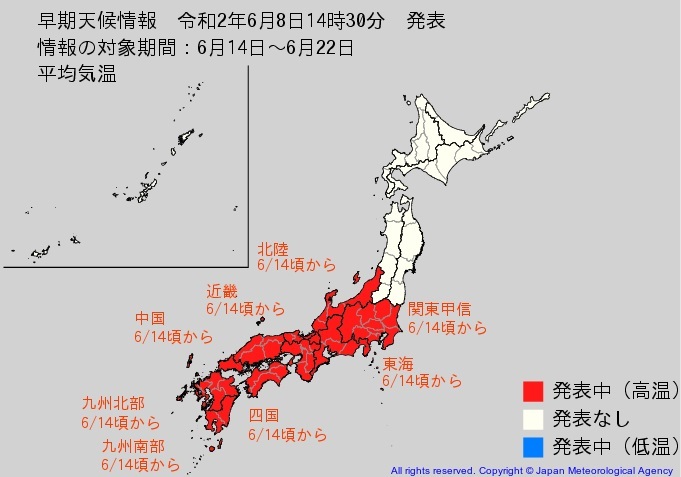 きのう(7日)までの1週間は、全国的に暖かい空気に覆われやすく気温が平年より高くなった。きょう8日も九州北部を中心に気温が上がり、久留米(福岡)で午後2時過ぎに35℃を超え、全国で今年初めて「猛暑日」となった。 向こう10日間~2週間程度も、引き続き暖かい空気に覆われやすいため、東・西日本は気温が高くなる見通し。特に、14日(日)からの5日間ほどは、かなり高くなる可能性がある。このため、気象庁はこれらの地方に「高温に関する早期天候情報」を発表して、農作物や家畜の管理等に注意するよう呼びかけている。