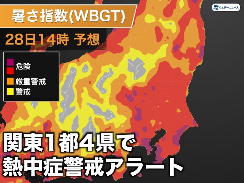 また、引き続き南から流れ込む湿った空気の影響で、湿度は非常に高くなります。 暑さ指数(WBGT)も高く、関東の広い範囲が危険レベルになる見込みで、東京や神奈川、千葉、栃木、群馬に熱中症警戒アラートが発表されました。8月も終盤ではありますが、引き続きこまめな水分補給・塩分補給を行うなどの対策をしっかりと行ってください。