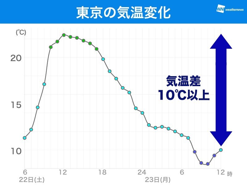 深夜より日中の方が気温が下がっていて、東京都心では10時過ぎには8℃まで下がりました。12時でも10.0℃と、初夏の陽気になった昨日22日(日)に比べて10℃以上低くなっています。
