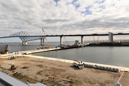 カヌー・スプリントのテスト大会を行う海の森水上競技場(江東区)で13日、屋根がない観客席に降雪機から雪を降らす。組織委によると国内のスポーツ大会では初の試み。過去の五輪でも記憶にないという。