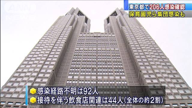 12日に東京都が確認した新型コロナウイルスの新たな感染者は206人で、4日連続で200人を超えました。 東京都によりますと、感染者206人のうち92人は感染経路が分かっていません。夜の繁華街の接待を伴う飲食店の従業員や客は44人で、全体の約2割でした。5日まで新宿区内の劇場で上演していた舞台を巡っては関係者20人の陽性が判明していますが、12日に新たに客ら5人の感染が確認されました。また、文京区立の保育園でも集団感染が起きていて、園児11人や保護者、保育士ら合わせて16人の感染が明らかになりました。この保育園では11日までに9人が陽性になっていて、感染者は園児19人を含む25人になりました。