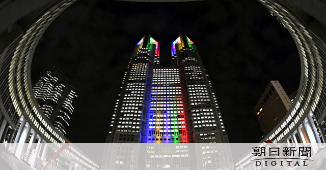 【動画】東京五輪の開幕まで200日となり、都庁第1本庁舎が五輪のシンボルカラーにライトアップ