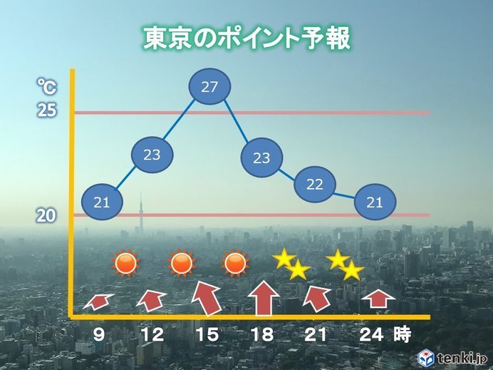 きょう13日の東京都心は、久々に朝からスッキリ晴れています。日中も、このまま晴れて、気温が上昇。少し動くと汗ばむほどになりそうです。