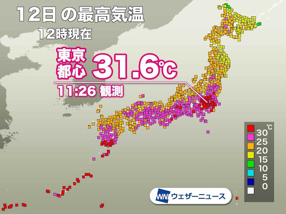 梅雨前線が南に離れ、久しぶりの日差しが届いています。また、関東の上空は約1500mで+18℃という暖かい空気に覆われていて、地上も気温が上がっています。 東京都心では正午までに31.6℃の最高気温を観測していて、午前中から真夏日になっています。 熱中症予防の目安となる暑さ指数(WBGT)も、関東広域で「厳重警戒」レベルとなっていますので、こまめに水分を摂るなど、熱中症対策を万全にしてください。屋内でも暑さを感じたら冷房や扇風機を活用してください。
