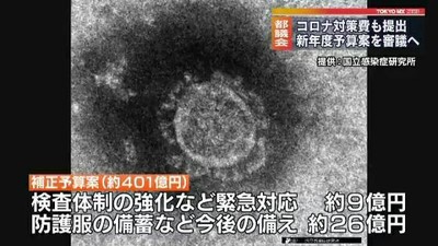 新型コロナウイルスの感染拡大や経済への影響を防ぐためのおよそ401億円の東京都補正予算案は、検査体制の強化などの緊急対応におよそ9億円▽防護服の備蓄など今後の備えにおよそ26億円▽影響が広がり続ける都内の企業に向けた緊急融資などの支援におよそ364億円が充てられます。