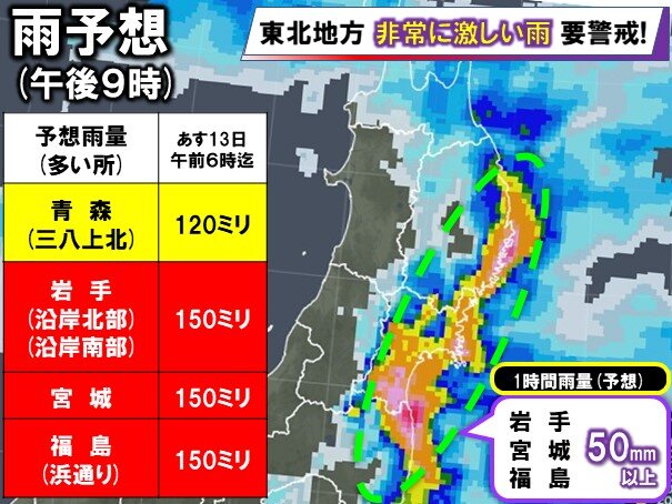 東北地方は大気の状態が非常に不安定になっています。きのう夕方は、福島県郡山市付近で1時間に100ミリを超える猛烈な雨が降ったとみられ、「記録的短時間大雨情報」が発表されたほか、福島県や山形県で局地的に1時間に50ミリ以上の非常に激しい雨が降りました。きょうも東北地方は太平洋側を中心に雷を伴って激しい雨が降る予想です。前線の活動が予想よりも活発になった場合は局地的に1時間に50ミリ以上の非常に激しい雨の降る恐れがあります。あす13日午前6時までに予想される24時間雨量はいずれも多い所で岩手県の沿岸北部と沿岸南部、宮城県、福島県の浜通りで150ミリ、青森県の三八上北で120ミリなどとなっています。