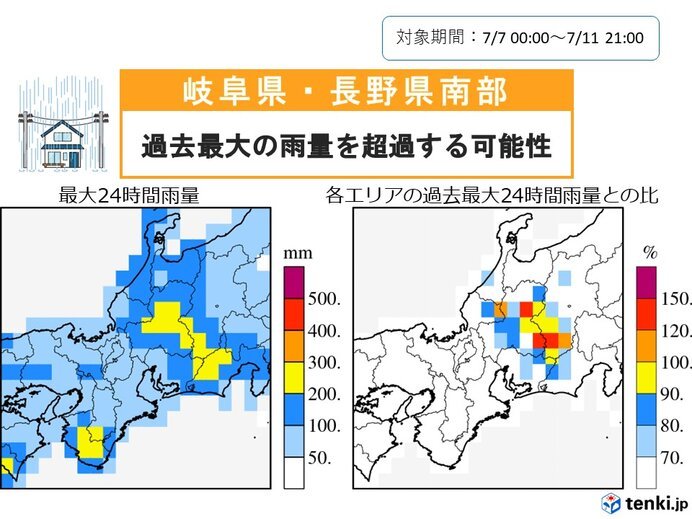岐阜県・長野県南部で過去最大雨量を超過する恐れあり