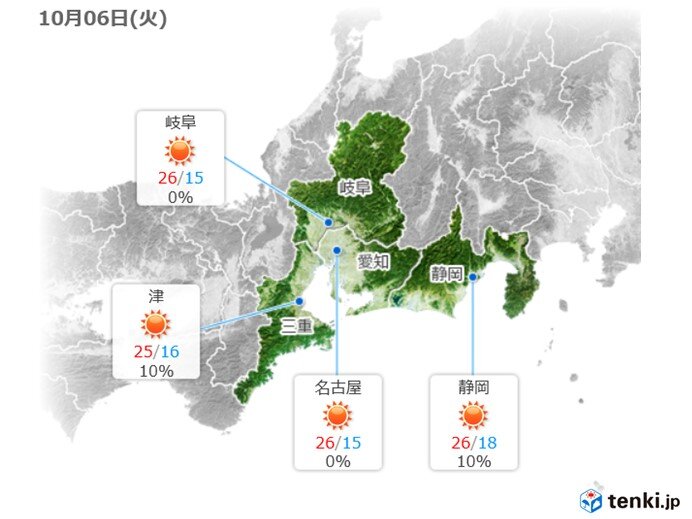 朝の最低気温は名古屋と岐阜で15度、津16度、静岡18度の予想です。