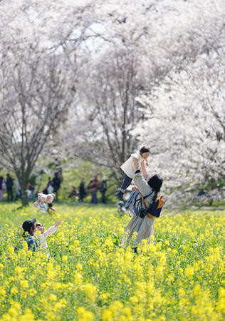 関東地方に雪が降る前、埼玉県幸手(さって)市の幸手権現堂桜堤で、満開の桜と菜の花の共演が花見客の目を楽しませていた。