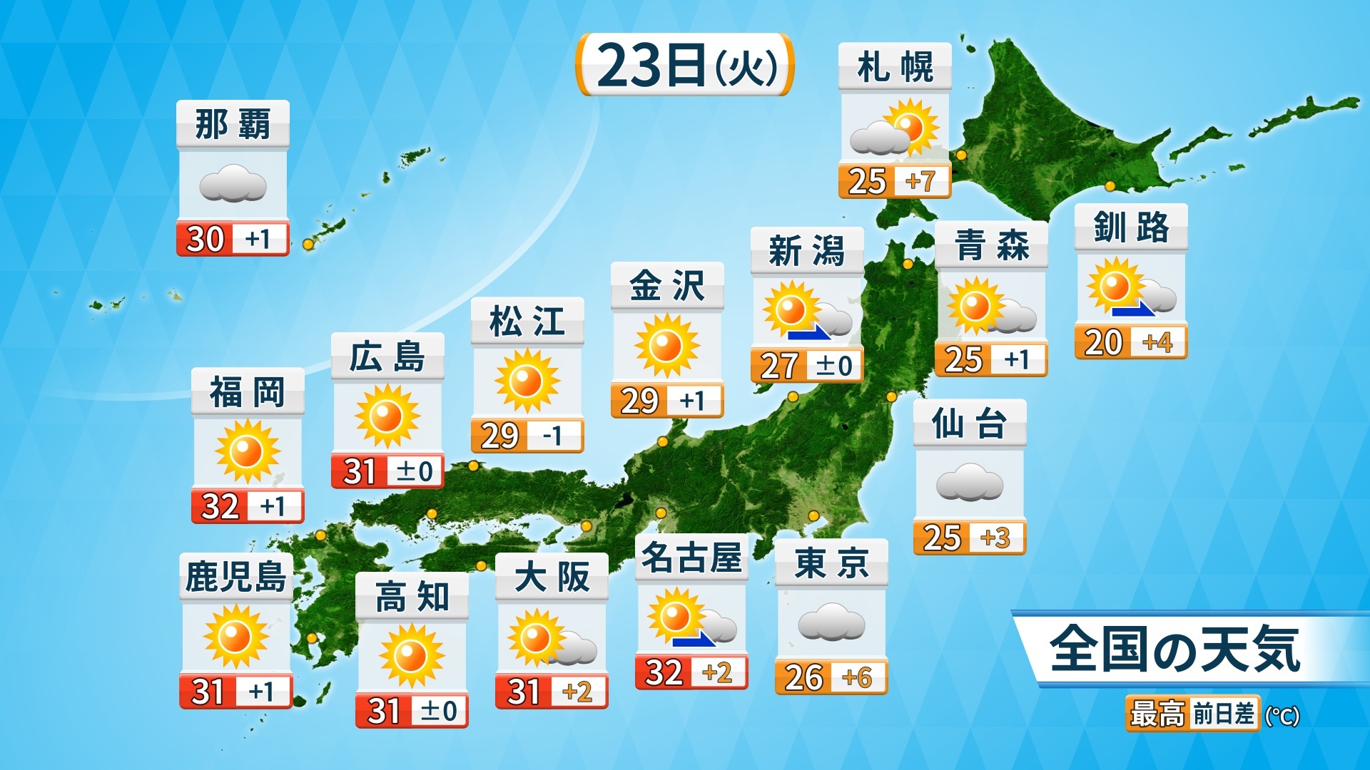 23日午後は、東海、北陸、西日本で晴れて、九州は最高気温35℃の猛暑日となる所がある見込み。あす24日(水)も同じような天気・気温となる所が多いため、熱中症など健康管理に注意が必要だ。
