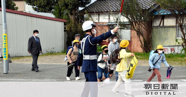 指定されたのは、市立東小学校から西へ約200メートルのところにある県道と市道が交差するT字路。三つの横断歩道があり、信号機はない。この日、同署員らはひっきりなしに通る車を整理しながら、登校する児童の横断を助けた。「おもいやり横断歩道」と記された黄色いステッカーを道路照明柱に貼り、遠くからもわかりやすくした。同署によると、この交差点では2004年以降10件の事故が起き、昨年には信号機の設置を求める要望があったという。