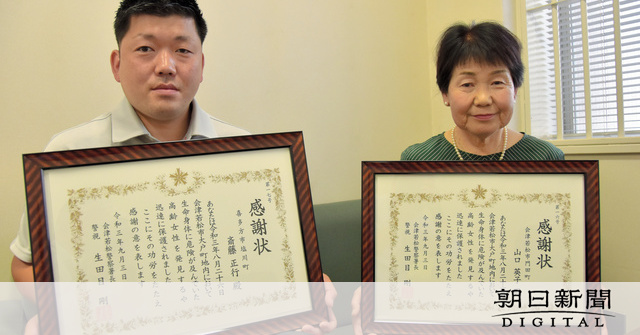 感謝状を受け取った山内さんは「斎藤さんに協力してもらい、たいへん助かった」。斎藤さんは「命は大切。助かってよかった」と話した。女性の家族から2人に感謝の電話があったという。(上田真仁)