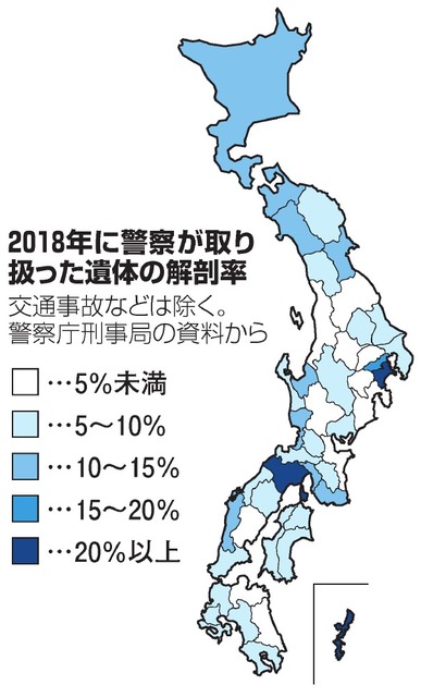 このため、13年4月に死因・身元調査法(調査法)が施行され、犯罪の疑いがないとされた遺体でも、警察署長の判断で家族の承諾がなくても解剖できるようになった。解剖が大幅に増えた地域もあるが、解剖率の全国平均は12年の11%から18年の12%と微増にとどまる。26府県はこの10年で一度も1割に達しなかった。