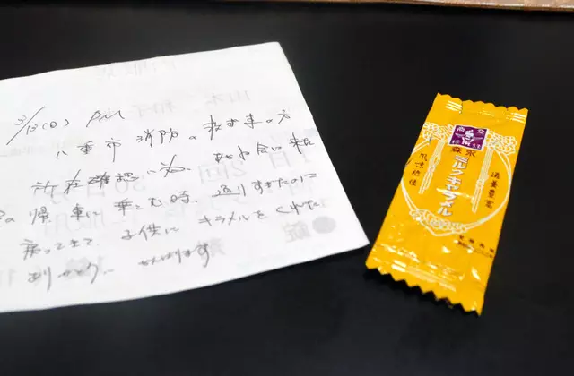 〈通りすぎたのに戻ってきて、子供にキラメルをくれた ありがとう がんばります〉