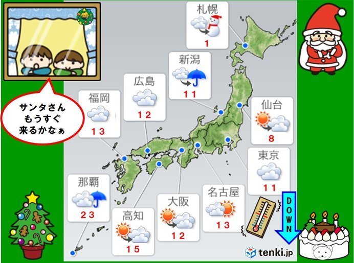全国的に雲が広がりやすく、日差しの出る時間は短いでしょう。ただ、昼間に雨や雪の降る所は少なく、年末年始に向けての買い物、大掃除などがはかどりそうです。