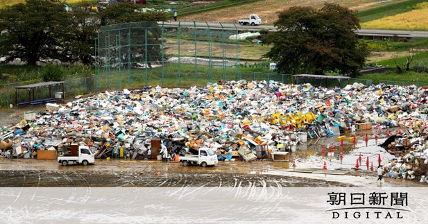 台風19号による記録的な豪雨で千曲川の堤防が決壊し、甚大な被害を受けた長野市赤沼地区の赤沼公園では22日、水につかって使えなくなった家財道具や電化製品などがうずたかく積み上げられていた。