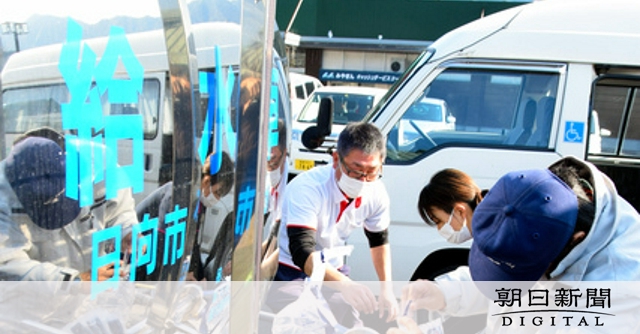 28日正午過ぎ、同市東郷町山陰辛の東郷公民館前に止められた給水車には、水をもらいに住民らが三々五々やってきた。担当者によると、午前中だけで22組に計1千リットル給水したという。