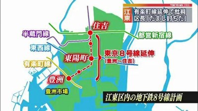 江東区は豊洲市場を受け入れる条件として、有楽町線を豊洲駅から住吉駅まで伸ばすことを東京都と合意しています。しかし、移転から8カ月がたった今も大きな進展はありません。