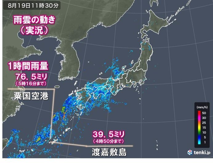 今朝(19日)、沖縄県には活発な雨雲がかかりました。粟国(アグニ)空港では1時間に76.5ミリ(5時16分まで)の滝のような非常に激しい雨を観測し、8月の1位の値を更新しました。そのほか、1時間に渡嘉敷島(トカシキジマ)で39.5ミリ(4時50分まで)、慶良間(ケラマ)空港で34.5ミリ(5時10分まで)のバケツをひっくり返したような激しい雨が降りました。