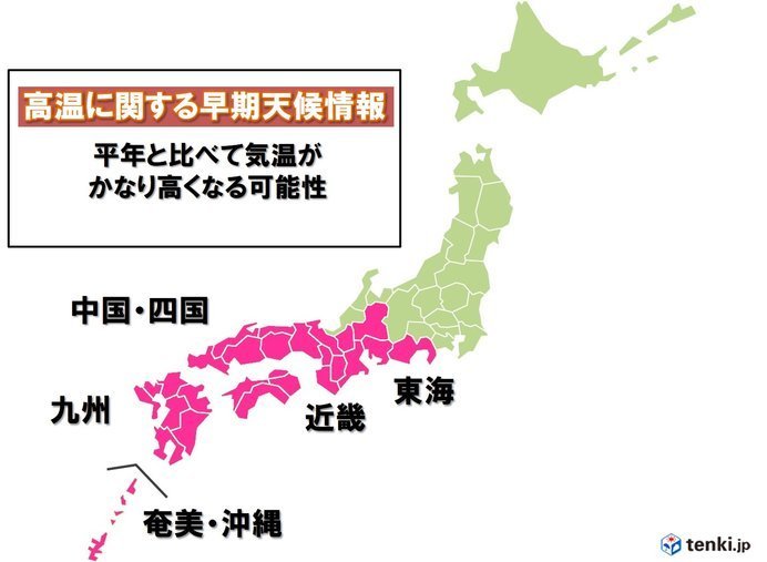 5日(月)、気象庁は沖縄から東海に「高温に関する早期天候情報」を発表しました。このところ気温の高い状態が続いており、今後2週間程度も暖かい空気に覆われることから、引き続き気温の高い日が多く、かなり高くなる日もある見込みです。