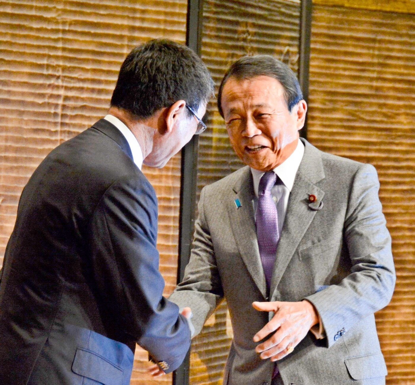 麻生氏は「だんだん成長しつつある。今しばらく時間を与えてほしい」とも述べた。自民党の鈴木俊一総務会長らも出席し、「同世代のリーダー」(世耕弘成参院幹事長)と期待する声が相次いだ。