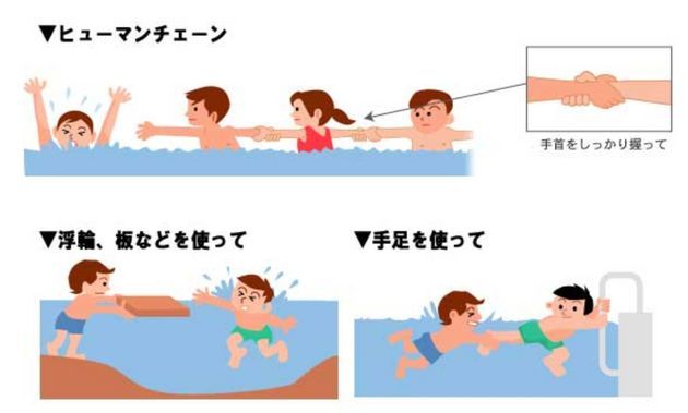 「長いもの」は棒や板切れ、ロープなど。 溺れている人に気付いてもらえるよう、大きな音を出したり「これから投げるよ」と声をかけたりしてから、その人の近くに上記の物を投げる。 水中に入って助ける場合は、複数の人が手をつなぎ、鎖のようにつながる「ヒューマンチェーン」を作り、先頭の人がクーラーボックスなどを持って溺れている人に近づき、物につかまらせる、という方法もある。