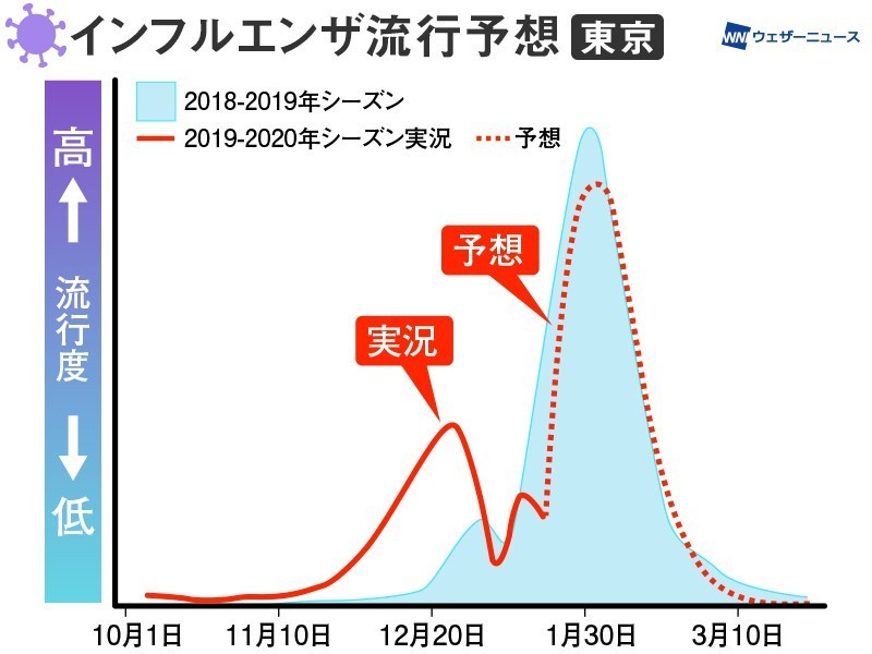 ウェザーニュースでは、厚生労働省が発表している過去の患者報告数などを元に、気象データとの相関をとり、今後のインフルエンザ流行予想を算出しました。