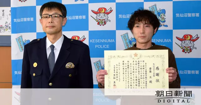 気仙沼署で25日、感謝状の贈呈式があった。笠松真治署長は「命の危険もあった中、連れてきて頂いた」とたたえた。斎藤さんは「川に落ちたら、車にひかれたら、と思うと気が気でなかった。無事で何よりでした」と語った。(星乃勇介)