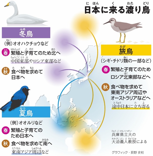 先生 鳥の中には、卵を産んでヒナを育てる場所と、冬を過ごす場所を季節ごとに移動する鳥がいるの。渡り鳥って言うよ。日本で見られる渡り鳥は大きく三つのタイプに分けられるよ。春に外国から日本にやってきて子育てをして、秋になると暖かい東南アジア周辺などに向かう渡り鳥を「夏鳥」というよ。また、日本で冬を越えて、春に中国東部やロシア東部などに向かうのが「冬鳥」よ。もう一つが「旅鳥」で、ロシア北東部などと、東南アジアやオーストラリアなどを季節によって移動する途中に日本に立ち寄るのよ。大きな群れで飛ぶ鳥もいれば、単独や少数で渡る鳥もいるわ。
