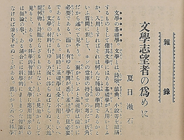 夏目漱石(1867~1916)が若い読者向けに語った文学観を、聞き書きした文章が確認された。1908(明治41)年9月発行の雑誌「青年評論」第4号に、「文学志望者のために」という題名で掲載されていた。一部の要約は別の雑誌に掲載されていたが、全文の存在は研究者にも知られていなかった。