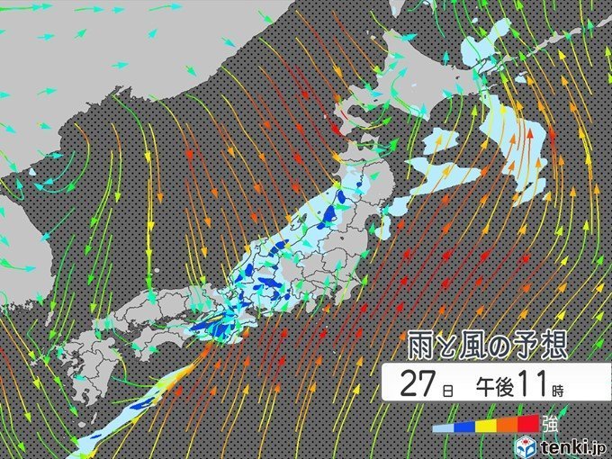 きょう27日(金)は、日本付近に暖かく湿った空気が流れ込み、広い範囲で雨が降りました。九州を中心に発達した雨雲がかかり、九州北部では1時間に30ミリを超えるような激しい雨の降った所もありました。九州の雨は峠を越えましたが、午後5時現在、四国や東海など一部に発達した雨雲があります。