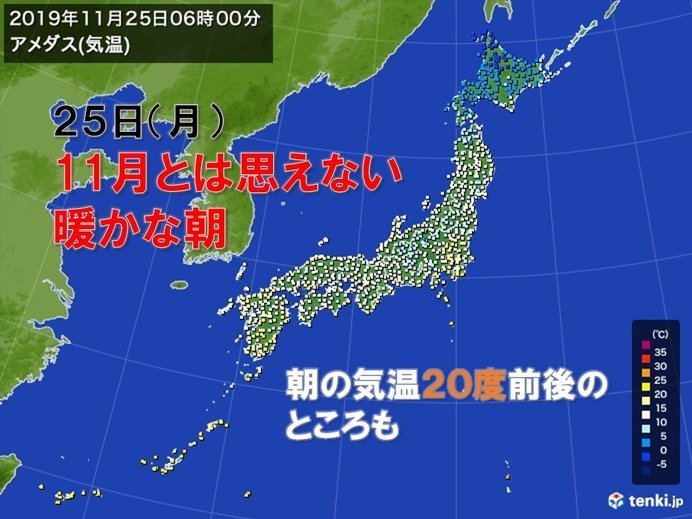 先週の朝の冷え込みから一変、25日の朝は、全国的にこの時季としては »かなり »暖かい朝となったところが多くなりました。朝の最低気温は、先週と比べて18度近く高くなったところも。ただ、ホッとするのもつかの間、あすから再び気温がグッと寒くなりそうです。この寒暖差で体調を崩さぬよう、お気を付けください。