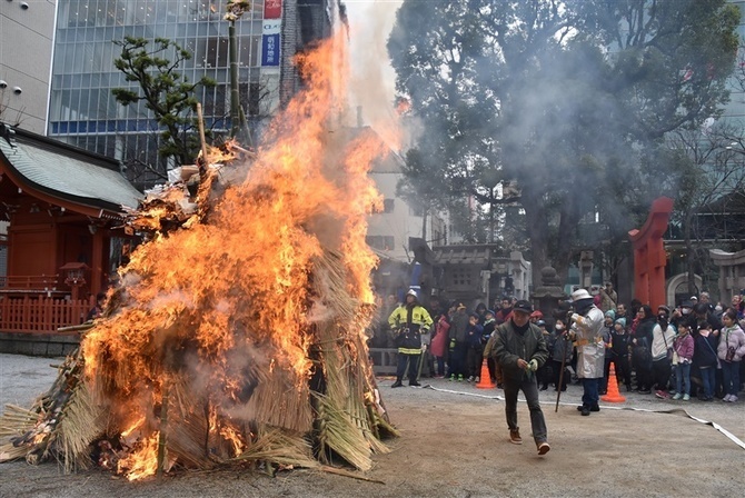 同市中央区の大名自治協議会が約30年前から、毎年実施。神事後、約5メートルの高さに組んだ竹に飾りなどが次々と投入され、地元の小学生が点火。一気に燃えて火柱が立つと「おー」と歓声が上がり、スマートフォンで写真を撮ったり、手をかざしたりする人もいた。残り火で餅を焼き、ぜんざいの振る舞いもあった。