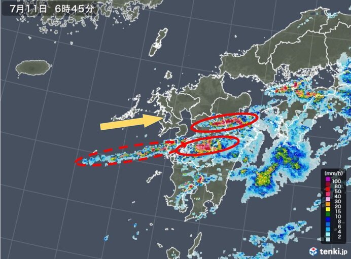 きょう11日明け方ごろから、熊本県の南部を中心に活発な雨雲がかかり続けているほか、現在は熊本県北部から大分県にかけても活発な雨雲が延びています。午前6時40分現在、熊本県八代市周辺や大分県竹田市周辺で土砂災害の危険度が「きわめて危険」なレベルに急上昇している所があります。球磨川の水位が高くなっているほか、熊本県や大分県の中小河川も洪水の危険度が高くなっている所があります。災害のおそれが高まっており、厳重な警戒が必要です。