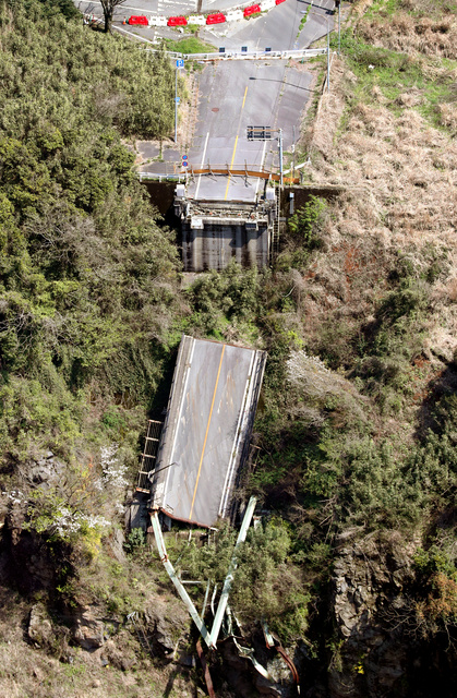 地震直後、崩落した様子は全国に大きく報道された。地震当時の区長だった竹原満博さん(59)は「橋は熊本市からの大動脈で、阿蘇のシンボルだった。落ちたときは『まさか』と思った」と振り返る。今も、現場を見学に訪れる人は後を絶たない。