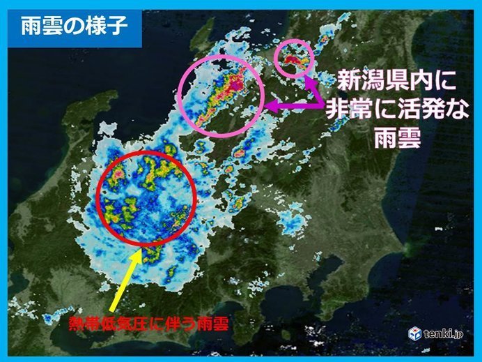 現在、熱帯低気圧に伴う活発な雨雲が、東海(主に岐阜県)から北陸、長野県付近にかかっています。昼間に比べると、雨雲が多少ばらけてきていますが、それでも所々に激しい雨を降らせています。また、熱帯低気圧本体ではないものの、少し離れた地域でも湿った空気が流れ込んでいる影響で、新潟県や福島県、群馬県などは、局地的に雨雲が発達しています。新潟県新発田市の赤谷では、午後10時40分までの1時間に52.0ミリの滝のような雨が降りました。冒頭の「雨雲の様子」を見ても、新潟県内では紫色の表示もあり、局地的には、人が圧迫感を受けるほどの降り方になっているとみられます。