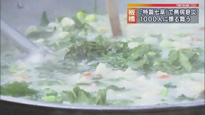 板橋区立城北公園の野球場で振る舞われたのは、1000人分の七草がゆです。春の七草のほか、区内で取れたサトイモやニンジンなどの野菜、つきたての餅も入ったボリューム満点の特製七草がゆです。来場者は1年の無病息災を願い、区内でしか食べられない新春の味を満喫していました。