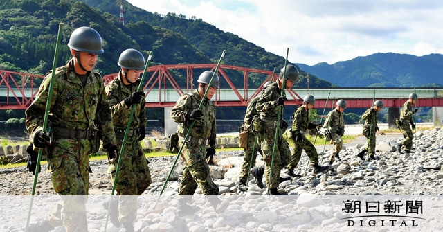 行方不明となっているのは、芦北町天月の城幸恵さん(90)と八代市坂本町中谷の谷口修二さん(63)の2人。八代市の球磨川大橋近くの河川敷では午前8時から自衛隊員が捜索。地面や橋げたに絡まった流木やアシを棒でどかしながら、河口に向かって歩いて捜した。中州のような人が入れない場所では、ドローンを使い、上空からの映像で確認していた。(松岡大将)