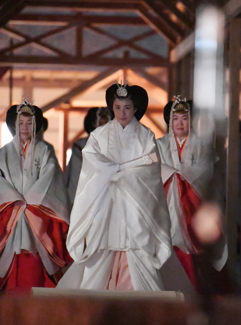 午後6時半すぎ、大嘗宮北側の廻立殿(かいりゅうでん)を出発した天皇陛下の行列が、悠紀殿に到着した。薄明かりの中をゆっくりと進む陛下は、最も清浄で神聖とされる白絹の「祭服(さいふく)」姿だった。悠紀殿内部の陛下の様子は外からは見えないが、天皇陛下が神々に新穀などを供えて拝礼。五穀豊穣や国家安寧を祈る内容の御告文を読み上げ、自らもお供え物を食す。後半の「主基殿供饌の儀」は15日午前0時半過ぎに始まった。
