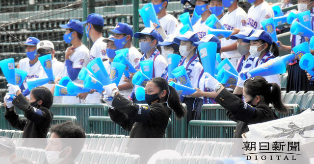 一塁側スタンドでは、選手の保護者や学校関係者約1千人が観戦した。新型コロナの感染防止対策で声は出せないため、学ランに身を包んだ応援団員は体全体を使った振り付けで必死にエールを送った。