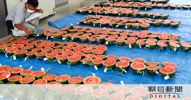 会社を訪ねると、ブルーシートの上には約200玉のスイカが半分に切られた状態で並んでいた。あたりには甘い匂いが漂う。技術開発部長の川口英之さん(53)はスプーンで味見をしたり、皮のしま模様を確認したり。「大きさ、重さ、形、甘さ、食感。全てを調べて記録に残します」