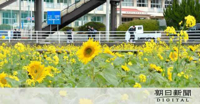 花畑は町の農業振興会が30年ほど前、観光地らしい景観にしようと耕作放棄地の草を刈り、菜の花をまいたのが始まり。その後、夏用にヒマワリも作るようになった。例年なら、こぼれ種が芽を出しても12月ごろの霜などで枯れてしまうが、今年はそれほど寒い日がなく、春めくほど暖かい日もあって数十本が花をつけた。管理する振興会の石井静夫援農センター長は「こんなことは初めてだ」と驚く。菜の花も今月中旬から下旬にかけて見ごろになるという。(石原幸宗)